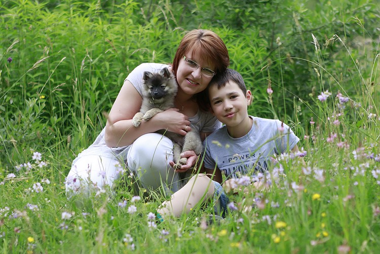 Žijeme již v době moderních technologií. Sedla jsem k internetu, vzala mobil do ruky a začala obvolávat inzeráty. Jsem tvrdohlavý a netrpělivý člověk. Bohužel v té době žádný vlkošedý pejsek volný nebyl. V pátek 22.5. 2015 mi přišla SMS od paní Miturové, že rezervaci na pejska Icona zrušili a nyní je tedy volný. Jestli chci, můžu se přijet podívat. No samozřejmě, kdo by váhal, že? Spolu s kamarádkou jsme si udělaly výlet. Iconek nás obě okouzlil. Domů jsme už jeli i se štěňátkem. Když se syn Míša odpoledne vrátil domů, nevěřil vlastním očím. Z Ikyho byl nadšený. Vlastně nadšení i přes nehody různého rázu přetrvává. Rád se s ním chlubí, dokonce ho i venčí a nejvíce je oba baví společné blbnutí.
